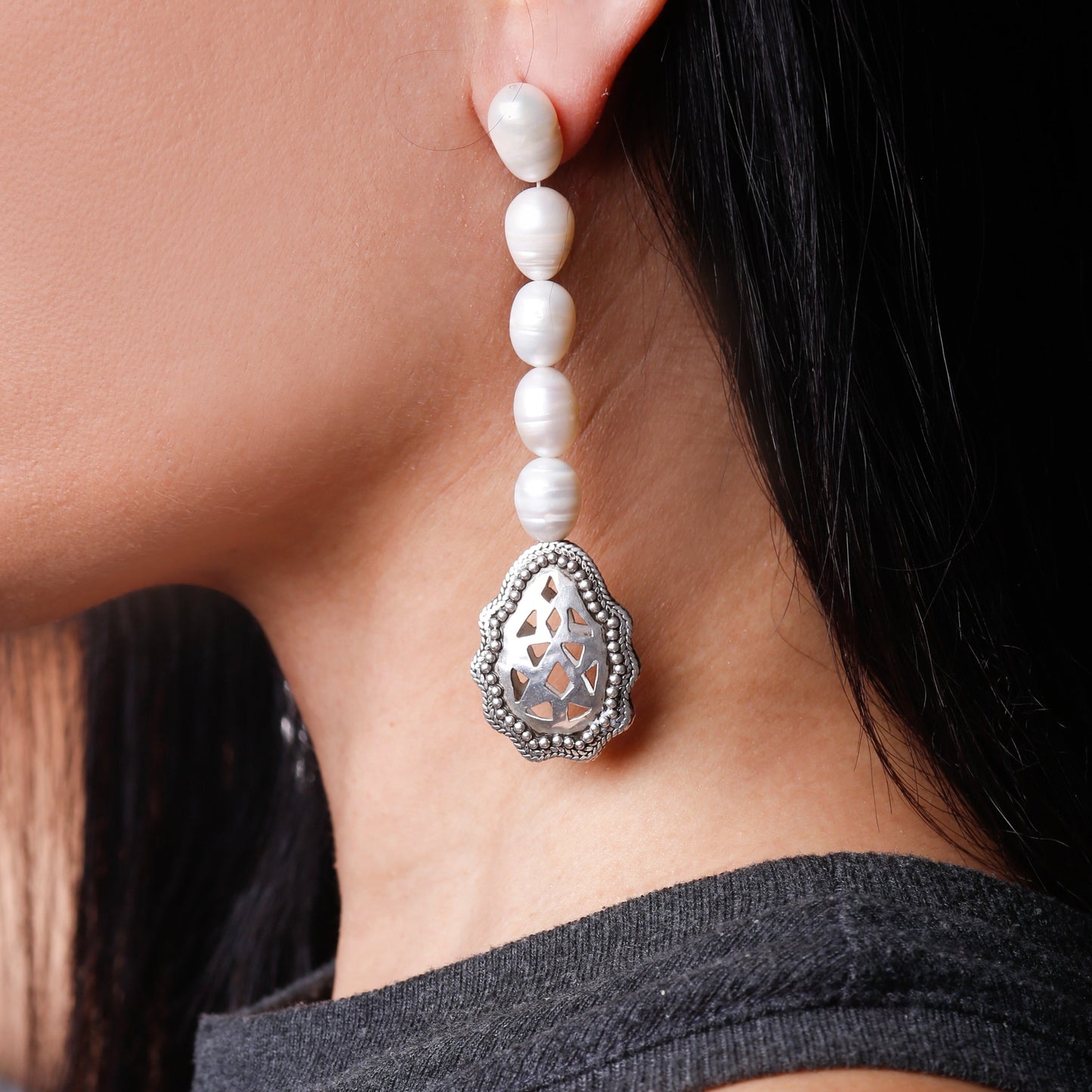 Embodiying simplicity in elegance, the carefully crafted pair of earrings is work of pure precision from the drop shape of the earring result of a meticulous Cutting and Ciseling work to the beautiful braid like details and silver micro beads. The beaded pearl add a nice touch of classic elegance