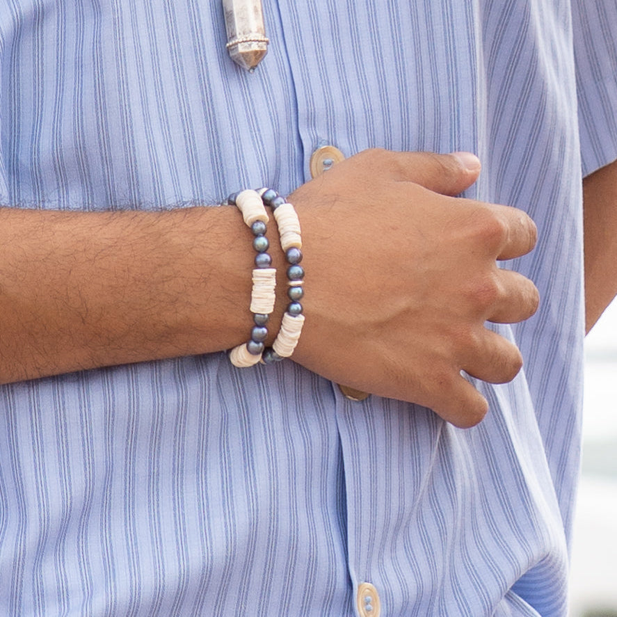This unisex piece features the mesmerizing iridescence of Tahitian pearls, interspersed with the natural simplicity of white seashells and the subtle shine of silver beads.