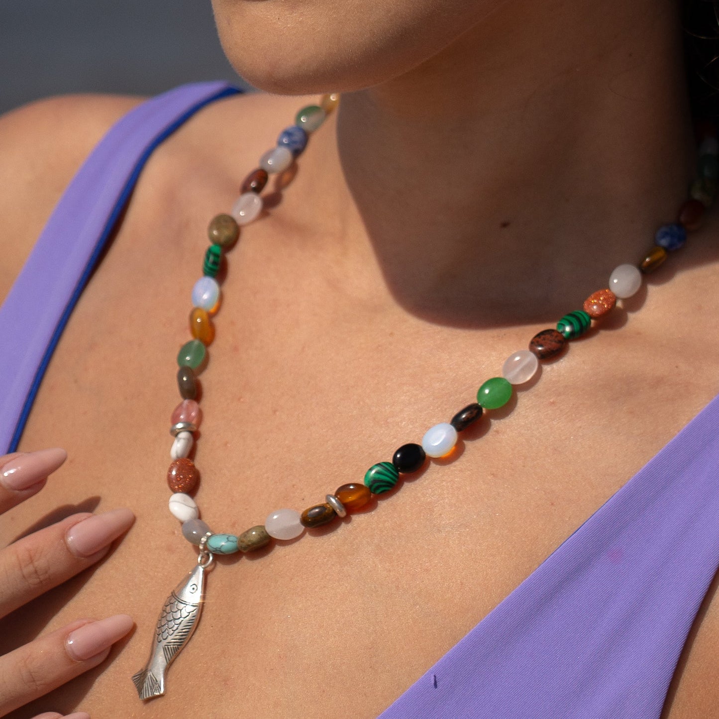 This unisex necklace celebrates nature's abundance through a captivating blend of natural pearls and stones in varied colors, evoking the hidden treasures of lagoons and the diverse landscapes of summer.