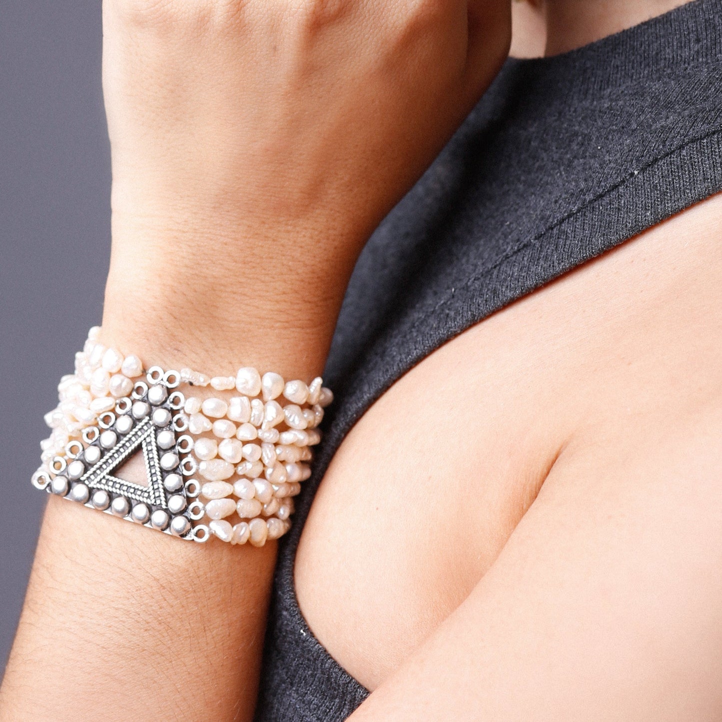 With its delicately woven pearls that seamlessly fit the carefully crafted fibula, this bracelet is a perfect balance of elegant and bold and will soon become an essential of your jewelry box.