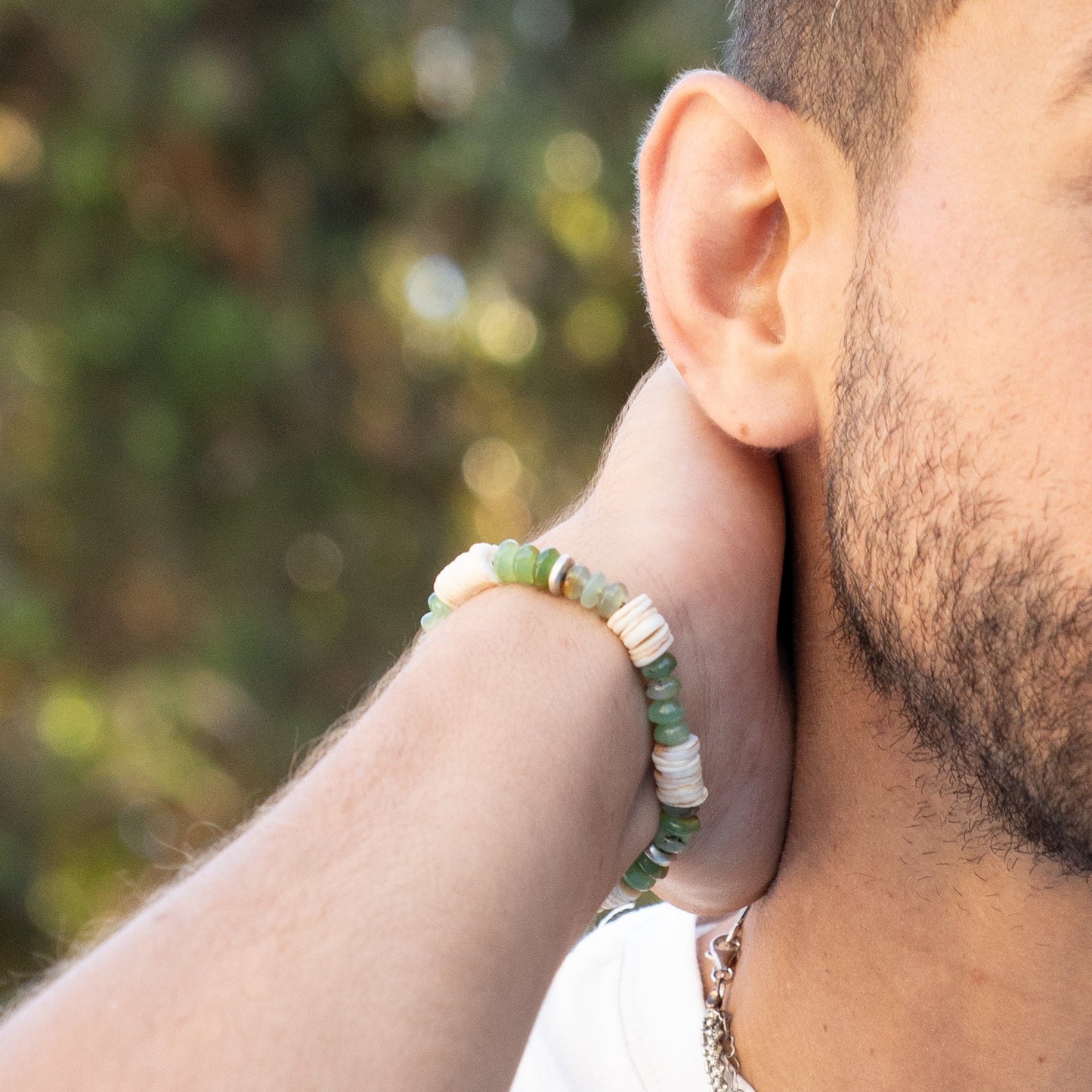 This unisex piece evokes the calm, clear waters of secluded bays and tropical havens, blending the soothing greens of Chrysoprase with the organic purity of cowrie shells and the subtle gleam of silver beads.