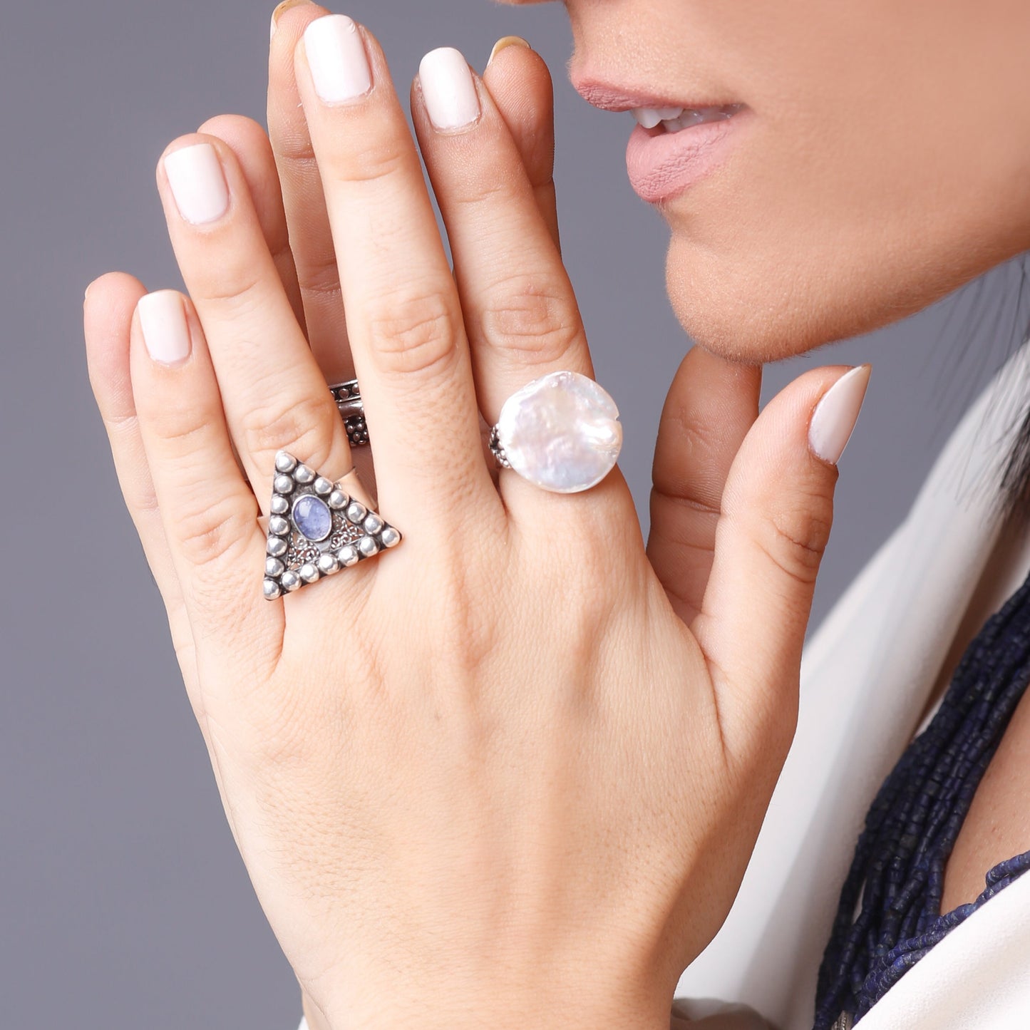 N'oublions pas le triangle inversé magnifiquement ciselé, symbole universel de l'eau. Cette bague incarne parfaitement l'essence de cette nouvelle collection.