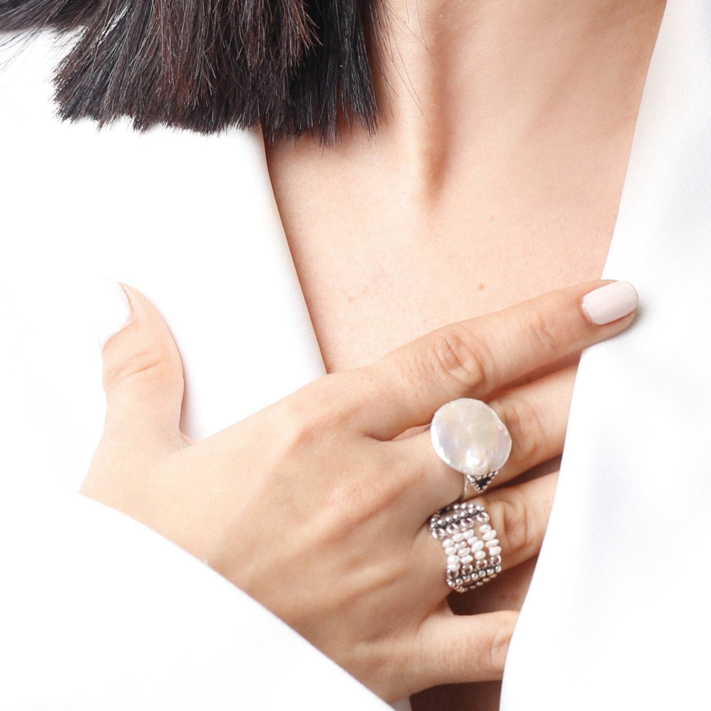 La bague en perles est sans conteste l'un des modèles les plus originaux de cette collection. Son délicat travail de perles évoque les vagues qui s'écrasent sur le sable de la plage.