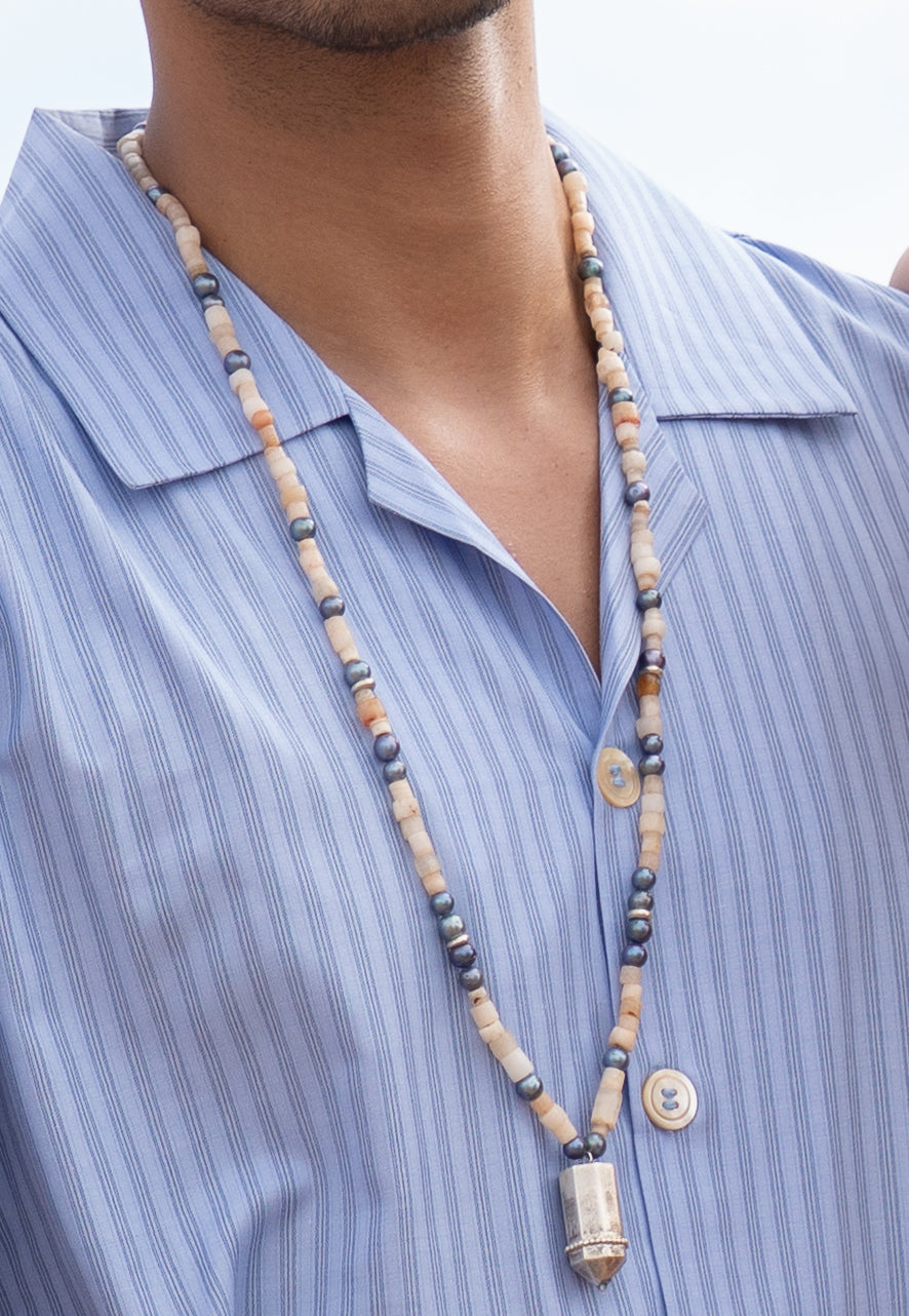 - Technique: Hand-chiseling (silver pendant), Stone and pearl stringing.