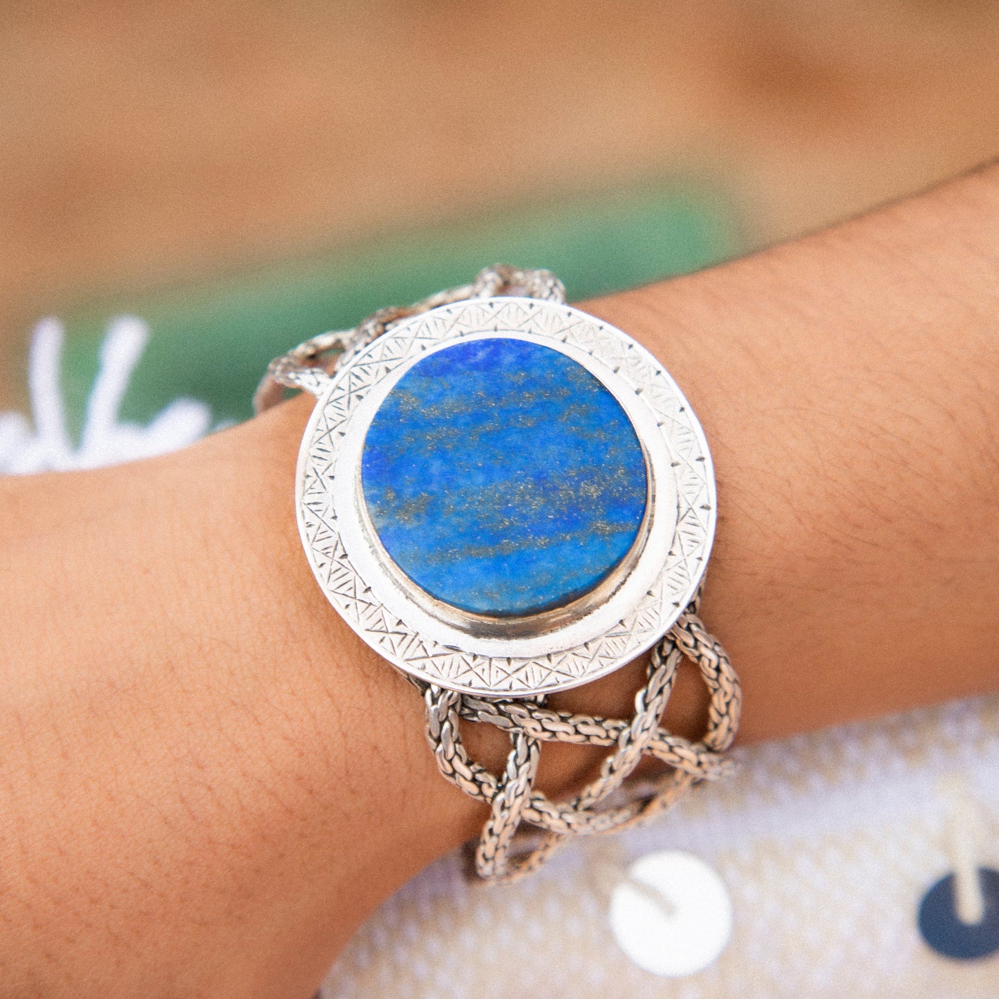 L'argent tressé à la main met en valeur l'incroyable savoir-faire artisanal qui caractérise le sud du Maroc et est surmonté d'une authentique pierre de lapis-lazuli, symbole de sérénité.